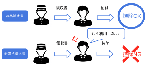 つまり、適格請求書の発行が出来ない場合、取引先やお客様が仕入税額を控除することが出来なくなるため、クレームや契約を切られる可能性があります。